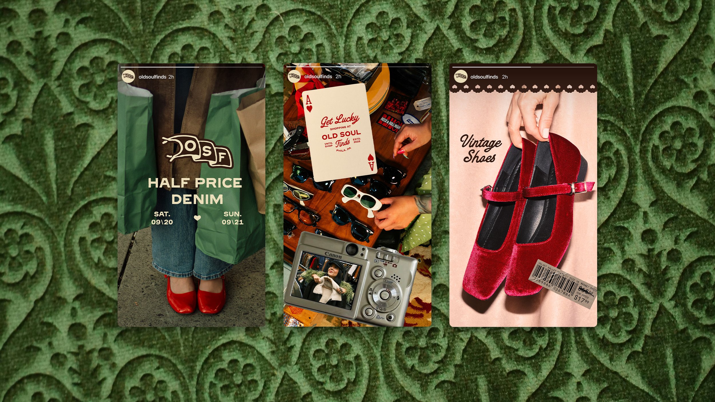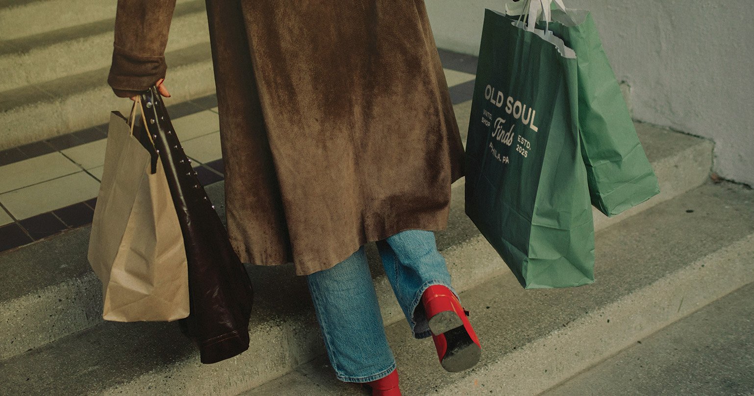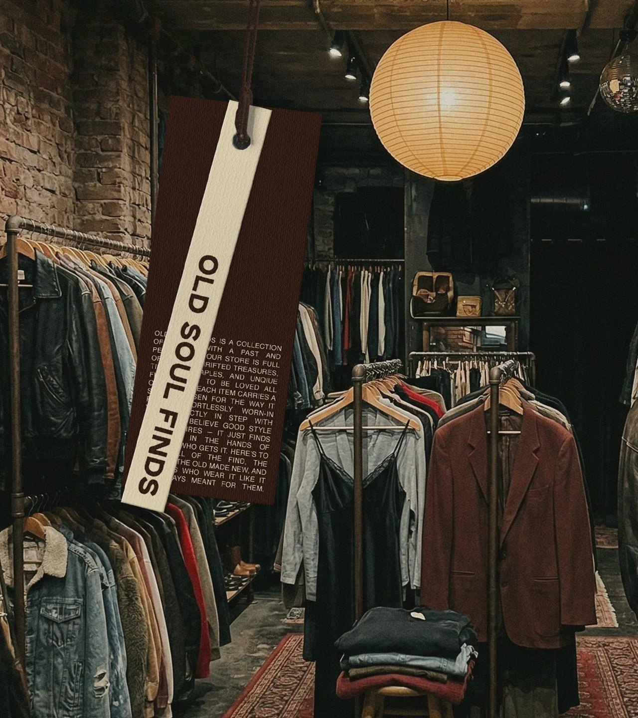 Branding for Old Soul Finds, a vintage store based on a Brief Club prompt. The identity feels curated and effortlessly cool, using expressive font pairings that let the unique vintage finds shine through out the branding. Rolled out across retail bags, tags, stickers, and social content, the brand channels a one-of-a kind pre-loved, thrifted energy.